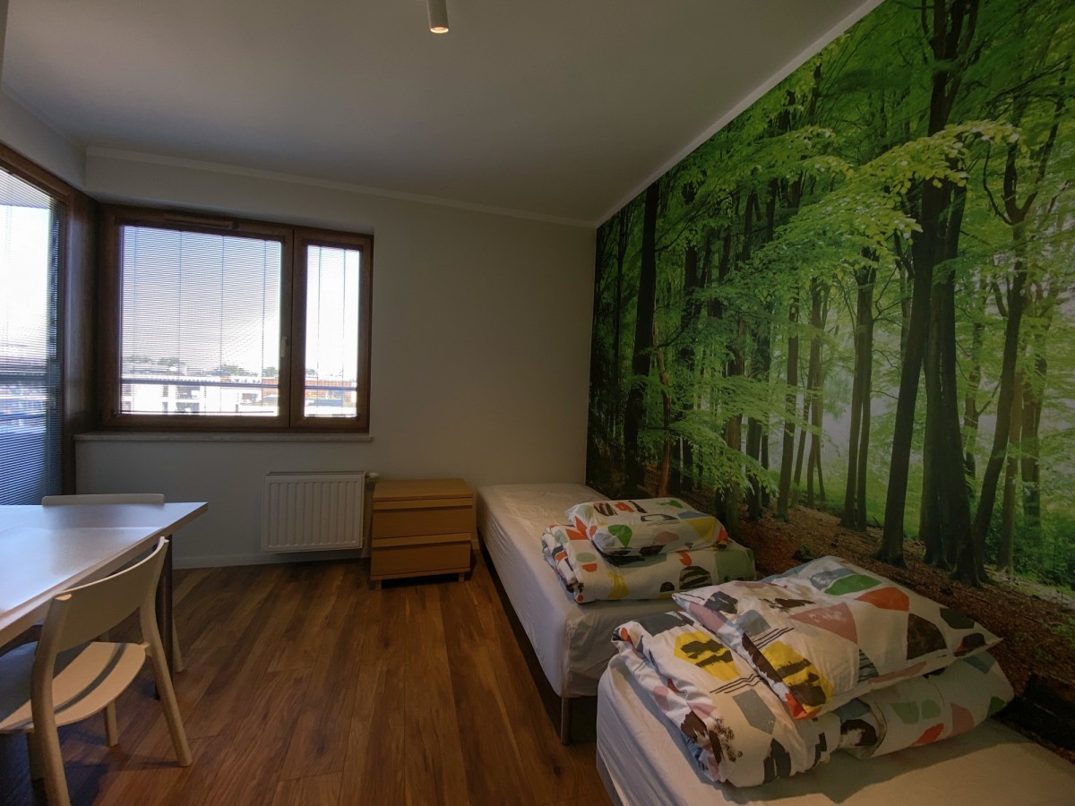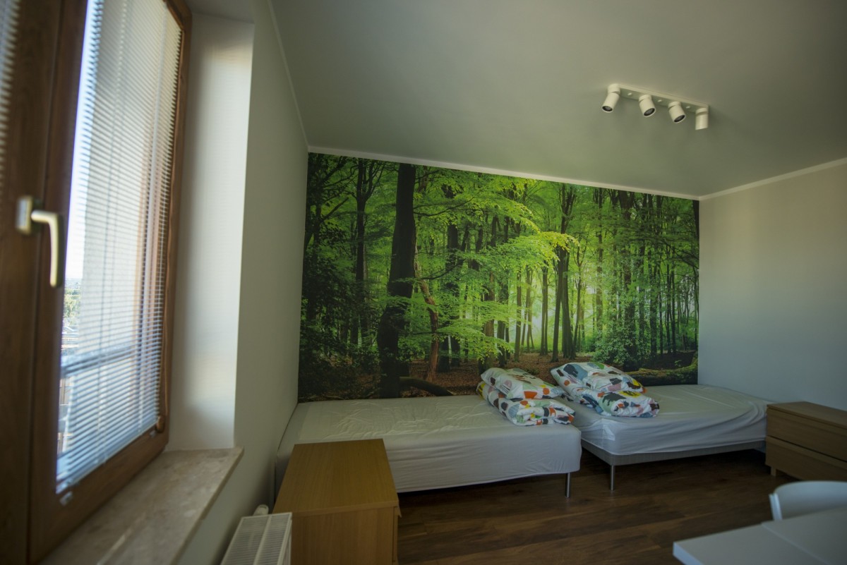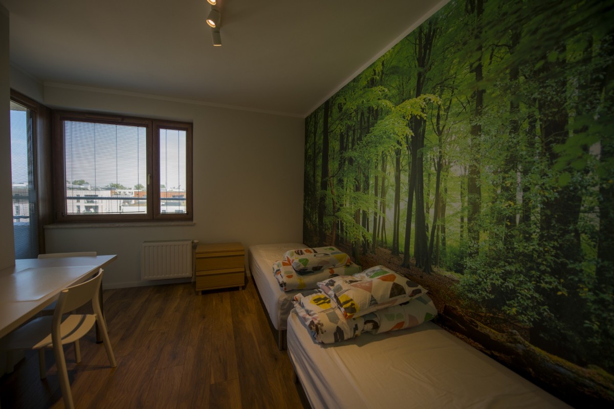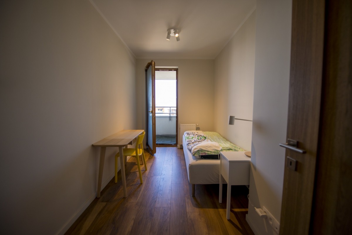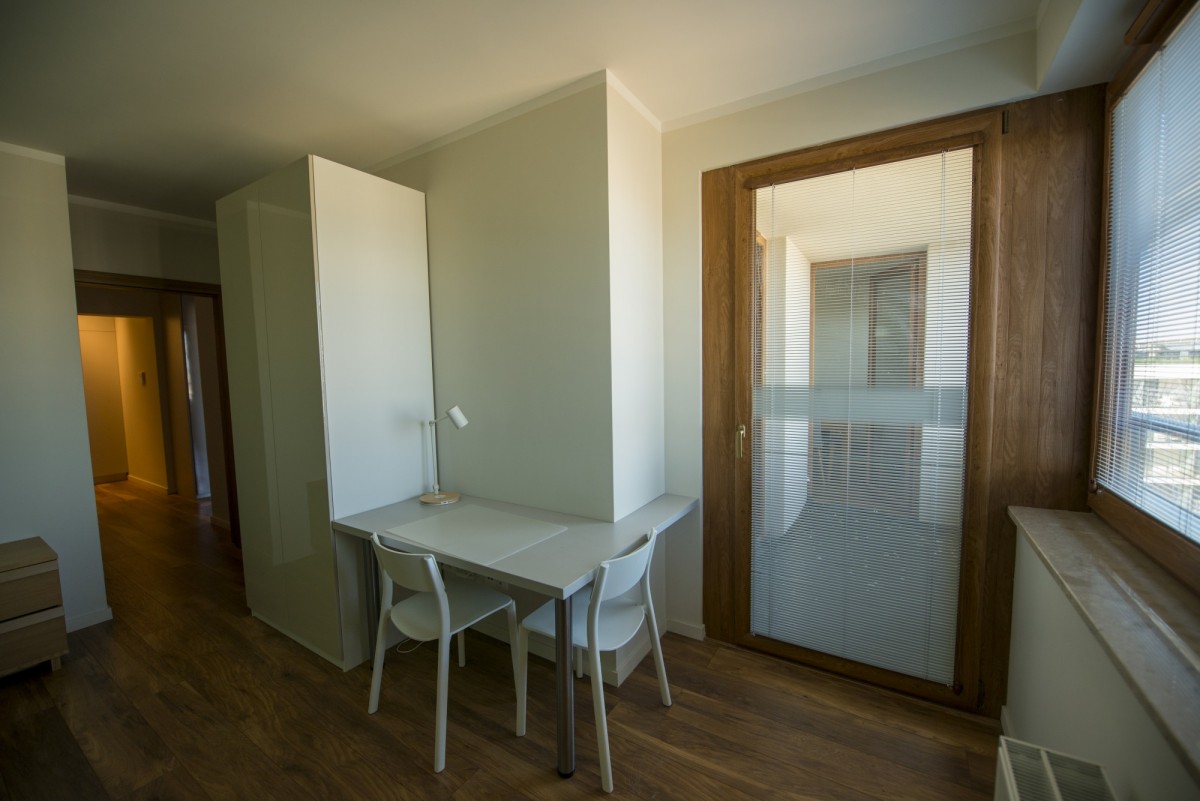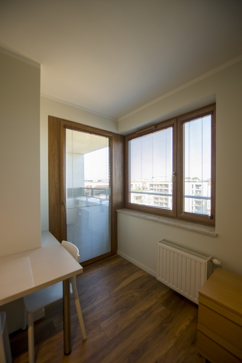 Pokój nr.2: szafka, podręczna szafka, biurko z krzesłem, wyjście na balkon, miejsce na dodatkową szafę ubraniową, wyjście na balkon.
