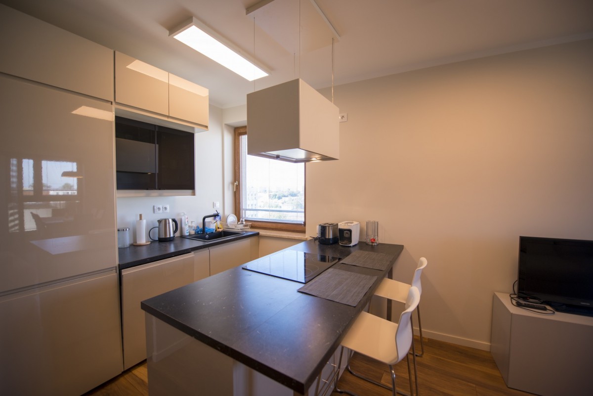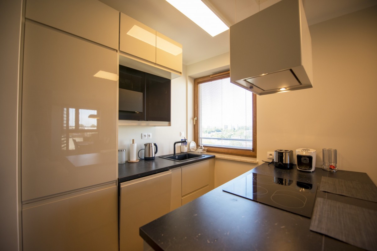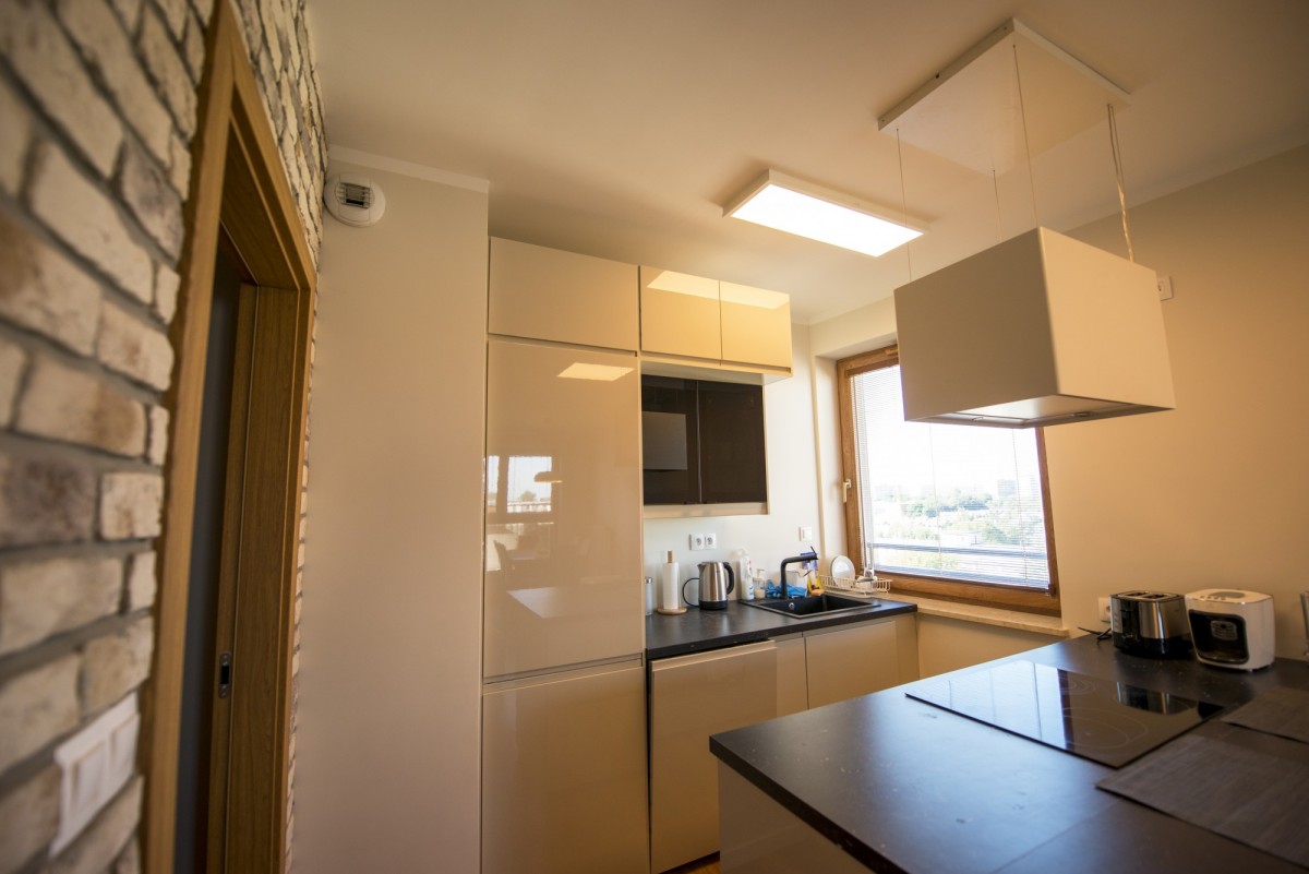 Wyposażenie kuchni/aneksu kuchennego: lodówka No Frost (z zamrażalnikiem z 3 szufladami), zmywarka, piekarnik (gotowanie/pieczenie na parze, grill, programy kulinarne, sonda temperatury potraw), płyta ceramiczna 4 pola (elektryczna, timer, duże pole), okap, górne oświetlenie led (regulacja jasności i ciepłoty światła)