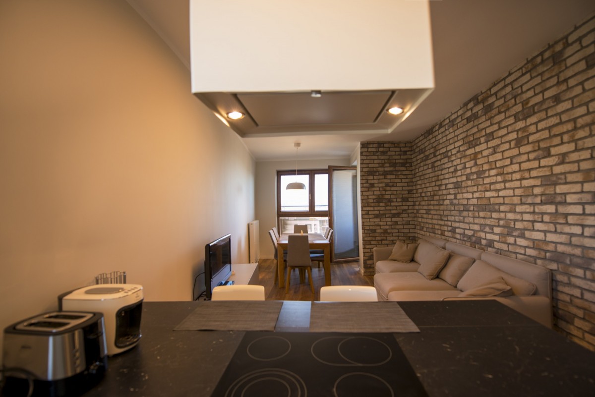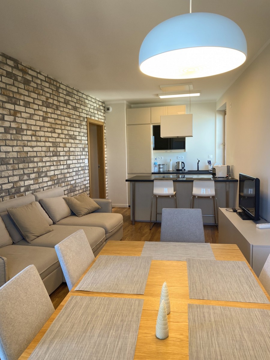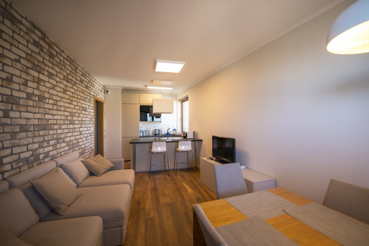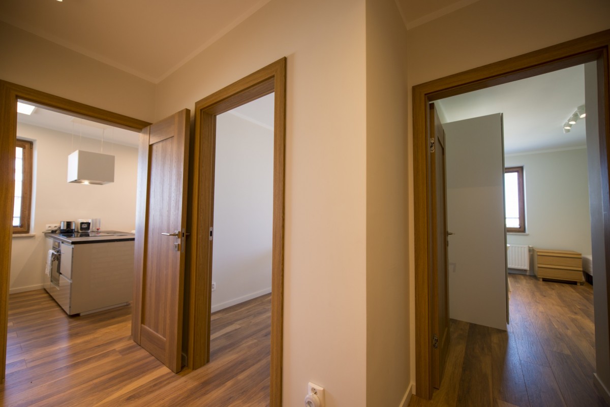 Pokoje: salon z aneksem kuchennym plus 2 mniejsze pokoje, ( dwie sypialnie, lub sypialnia i gabinet), łazienka (wanna z prysznicem)