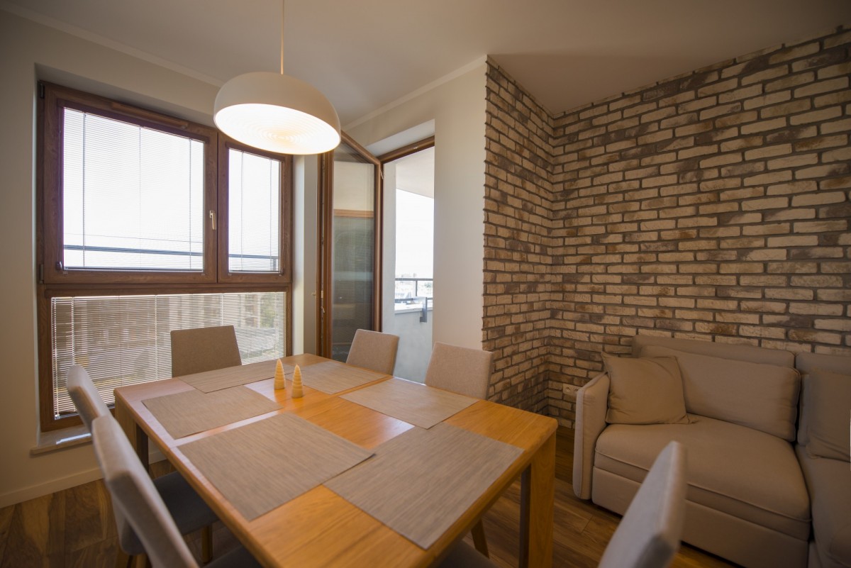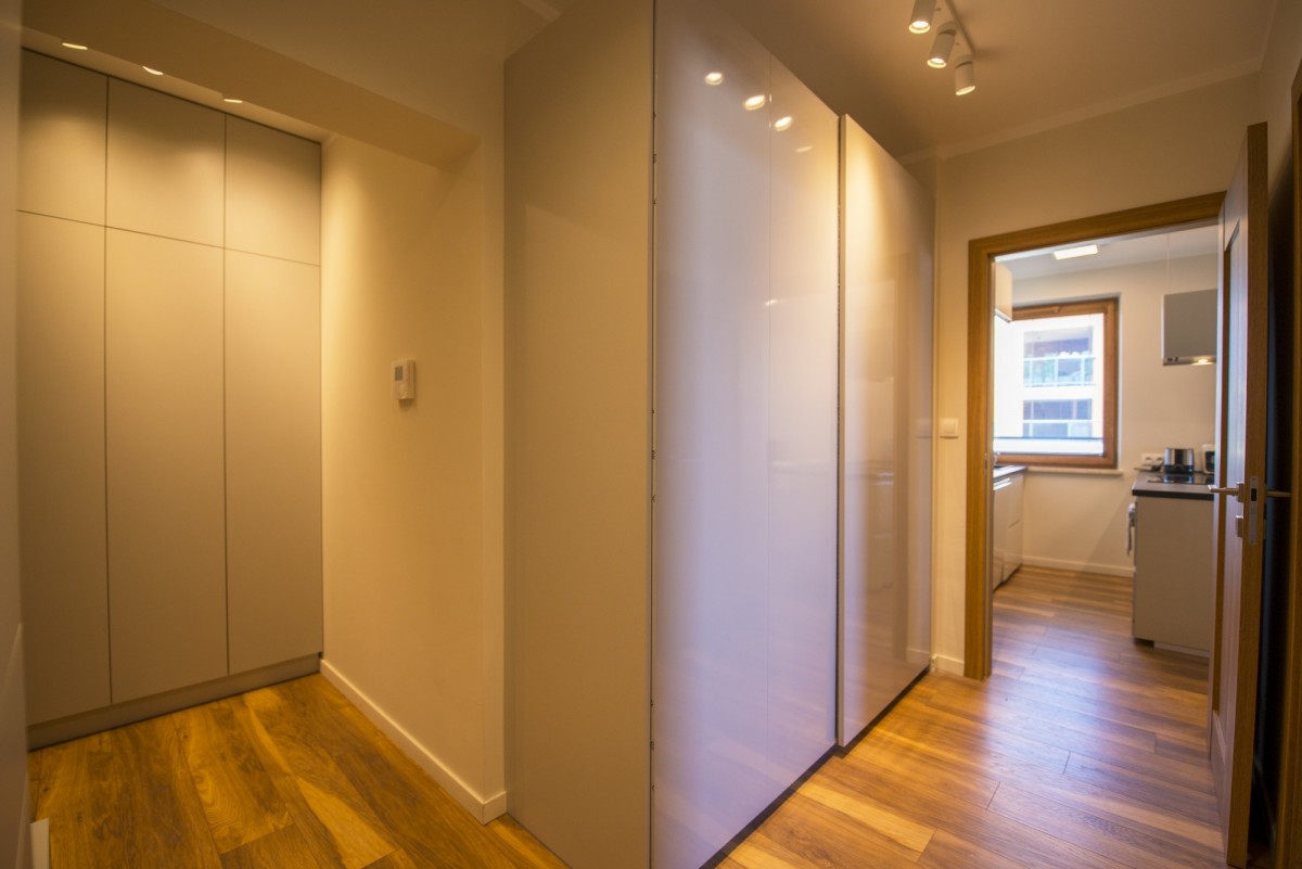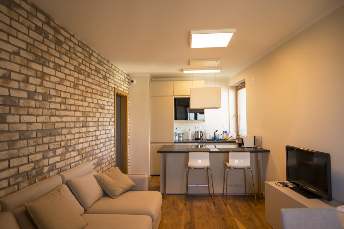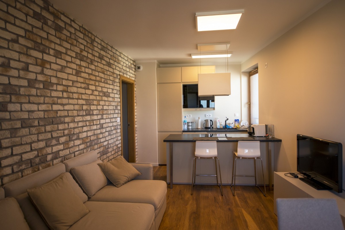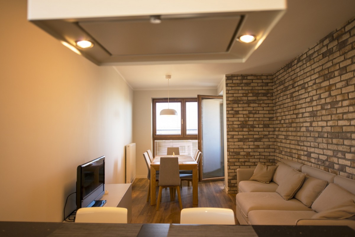 Pokoje: salon z aneksem kuchennym plus 2 mniejsze pokoje, ( dwie sypialnie, lub sypialnia i gabinet), łazienka (wanna z prysznicem)
