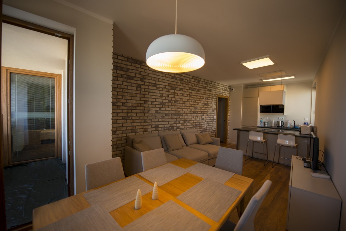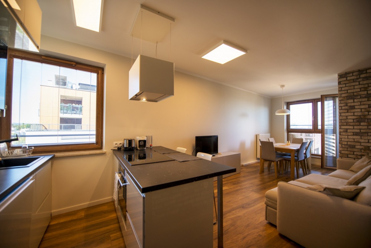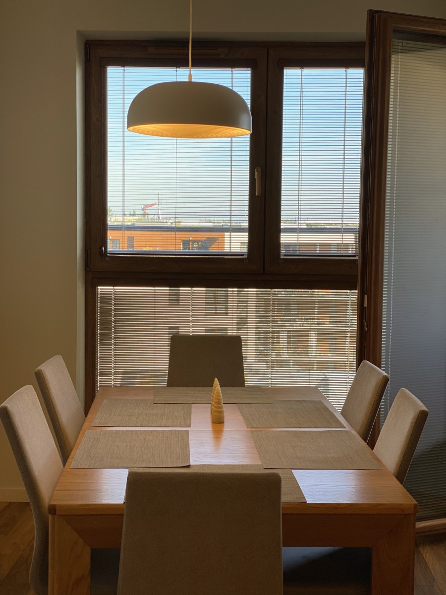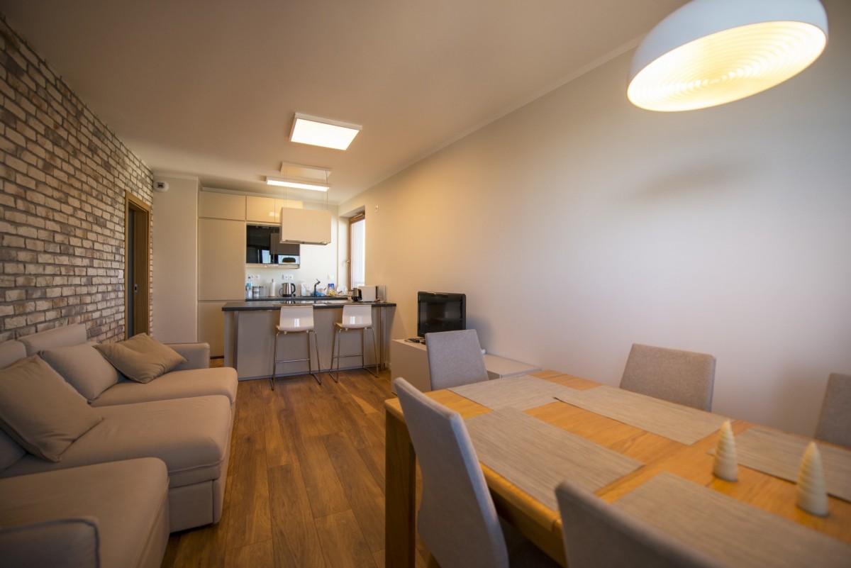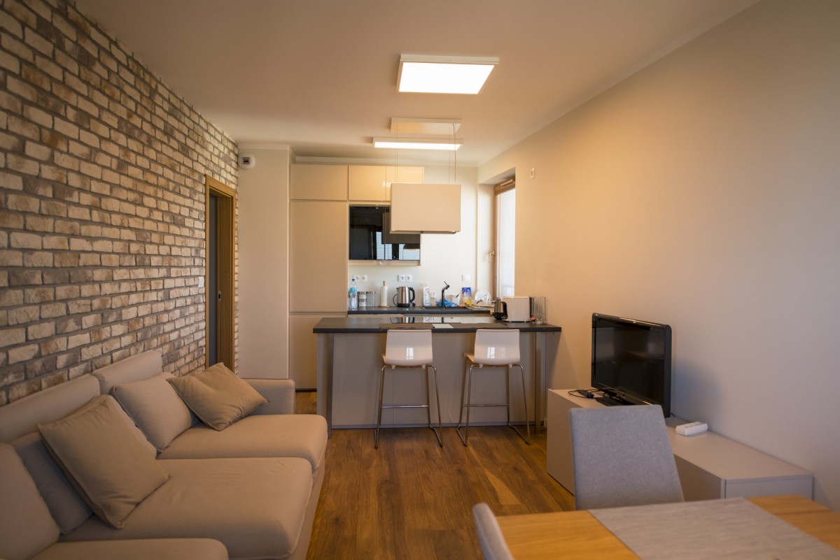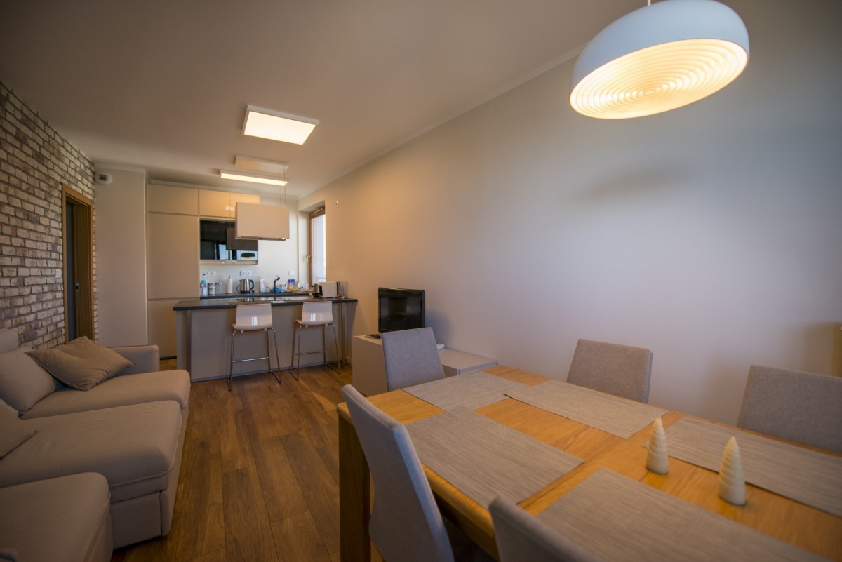 Pokój nr.3: salon - stół na 6 osób z krzesłami, niska komoda pod TV z szufladami na pościel, kanapa modułowa z możliwością rozłożenia do spania dla dwóch osób, schowek w kanapie, aneks kuchenny wyspa z płytą ceramiczną i piekarnikiem, dużo szuflad, dwa krzesła barowe, duży zlewozmywak, zmywarka, szafki, duża lodówka z zamrażalnikiem, wyjście na balkon.