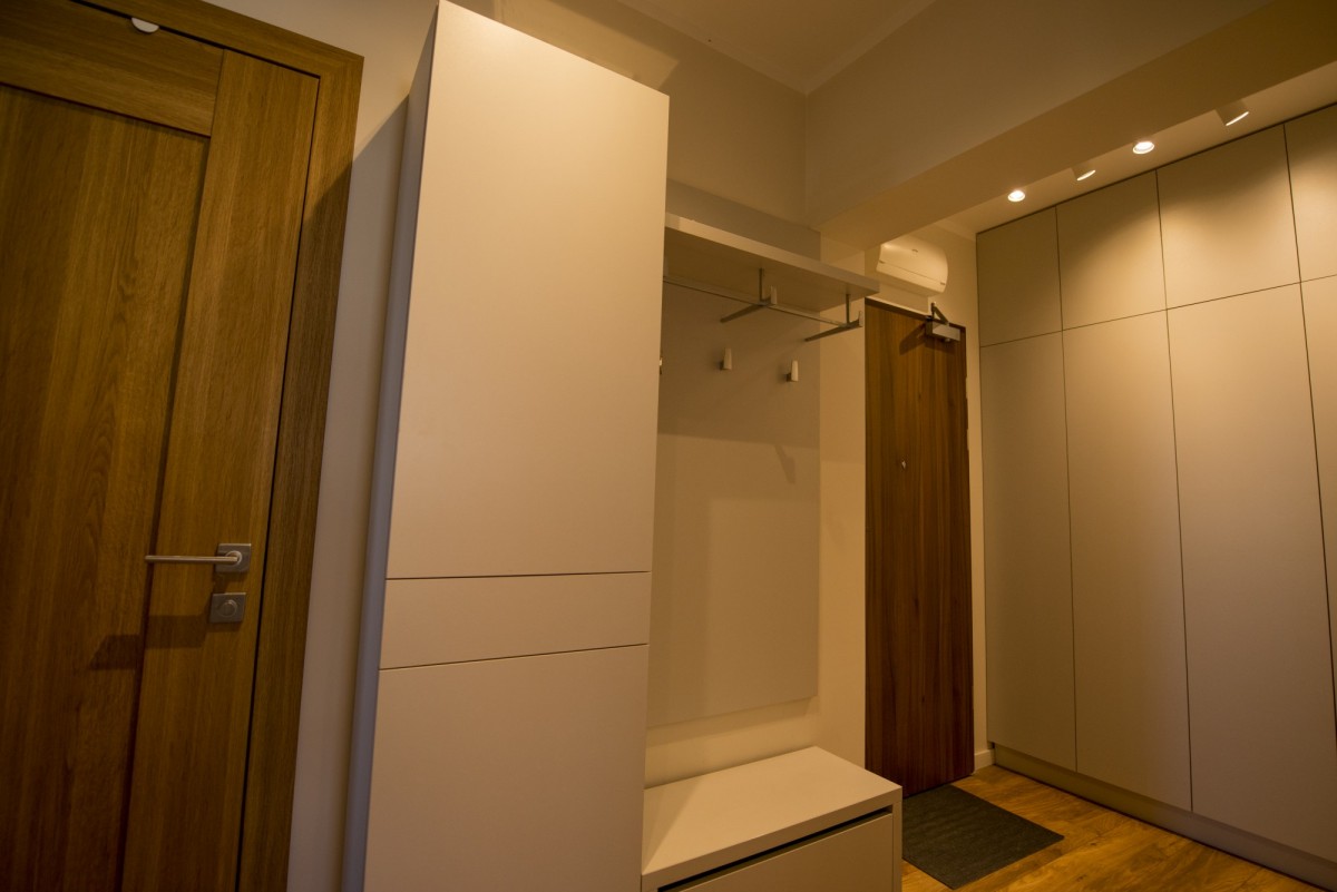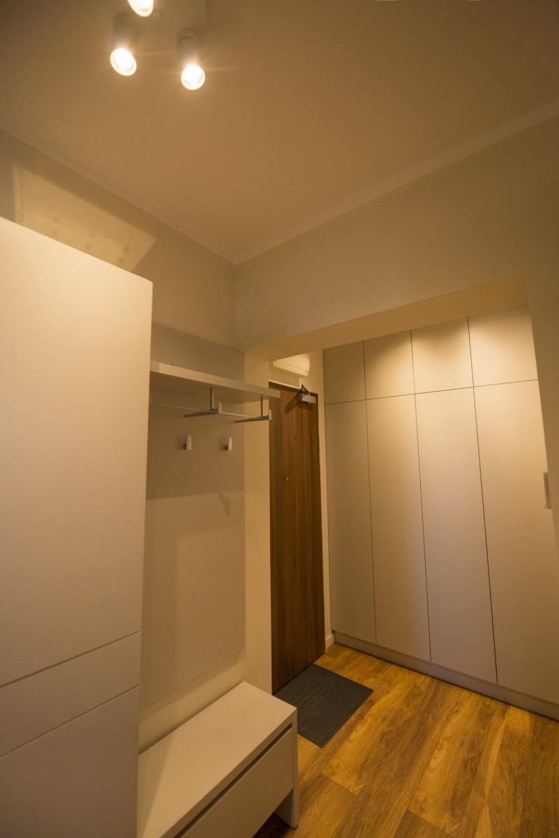 hol z dwoma szafami (jedna duża wieszaki i szuflady, druga mniejsza) + szafka na buty i wieszaki na ubrania.
