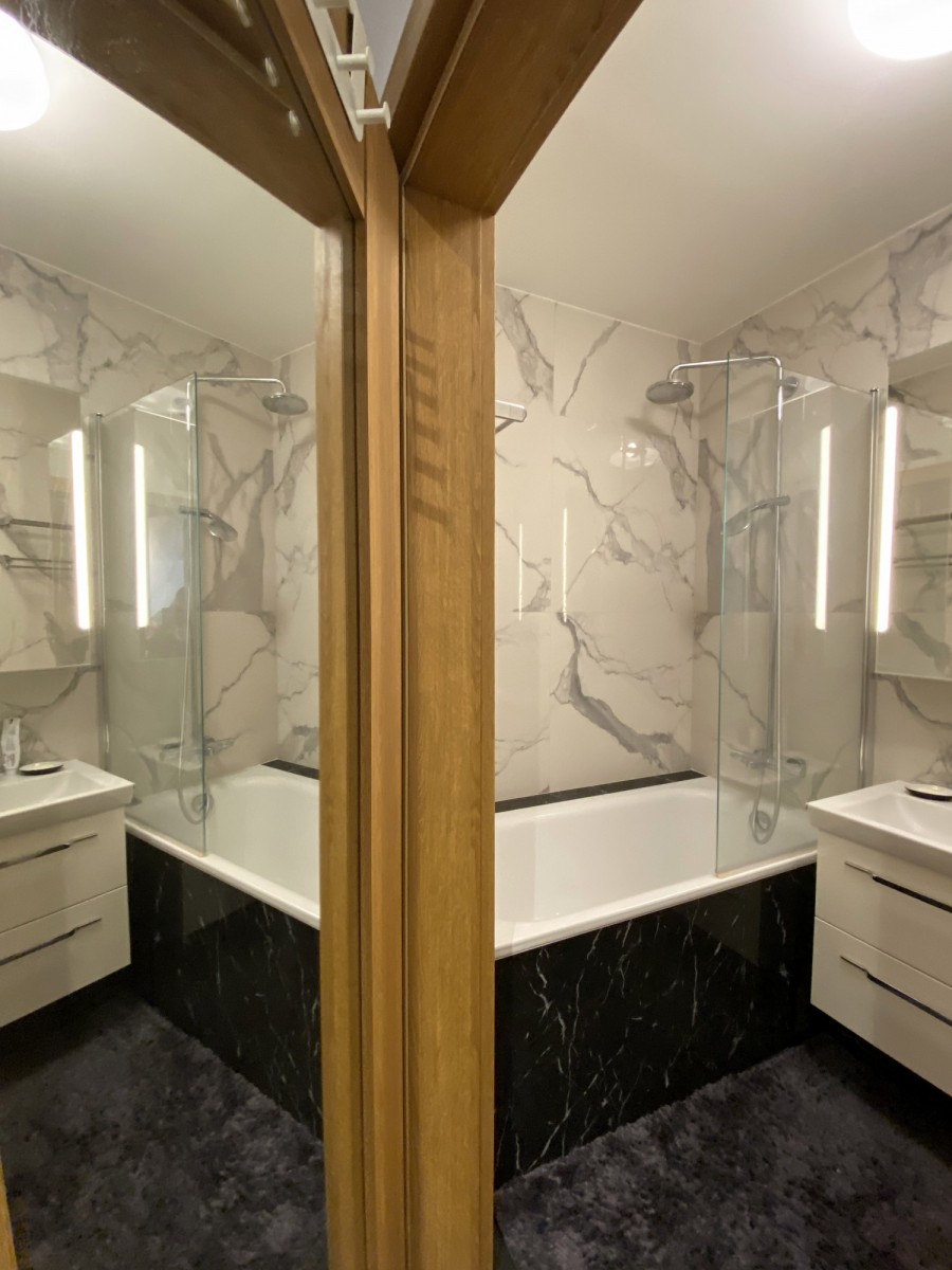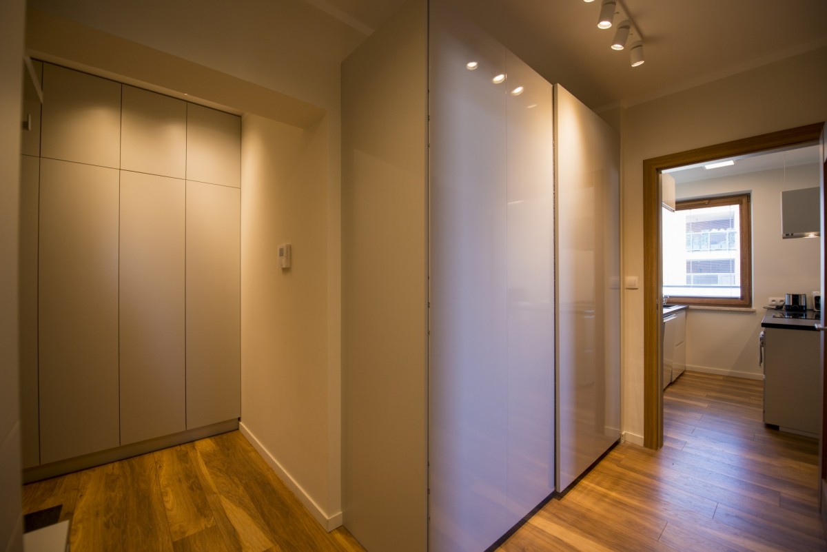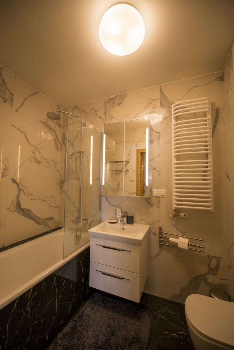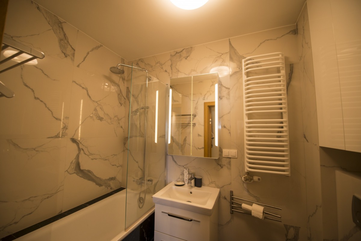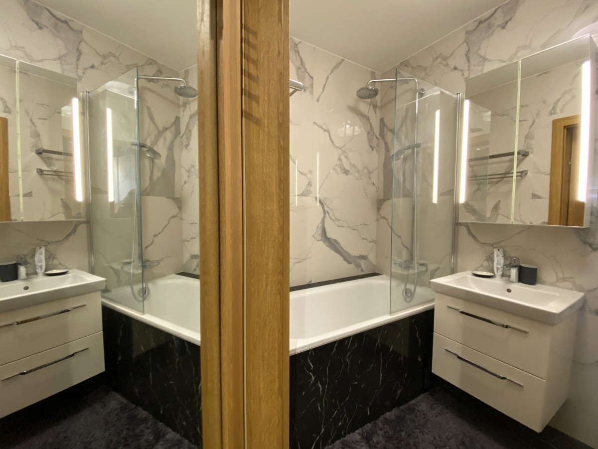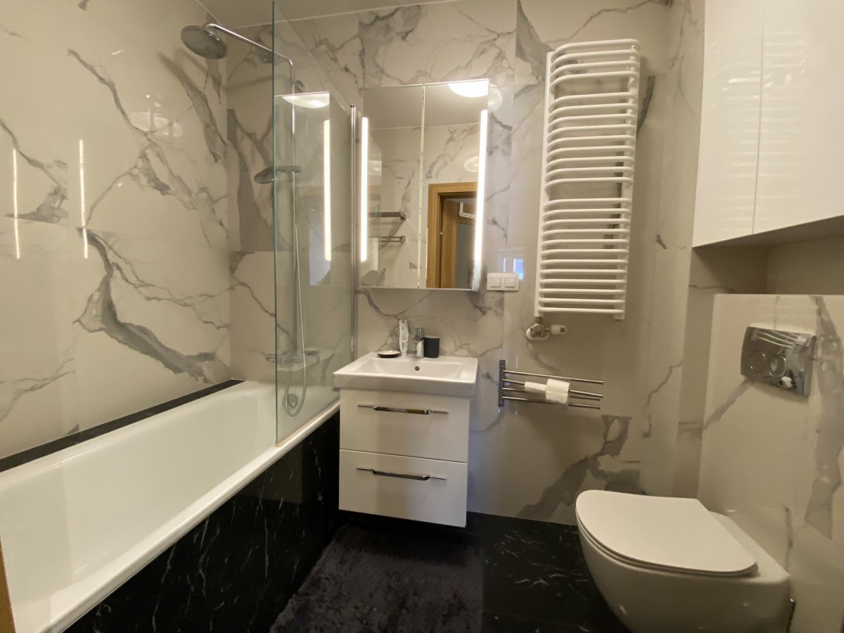Łazienka: wanna z prysznicem i deszczownicą, bateria z termostatem, umywalka z szafką szuflady „pod” i „nad” szafka z lustrem, dodatkowa szafka wisząca, dodatkowe lustro w drzwiach, wieszaki, miejsce na pralkę (60cm).