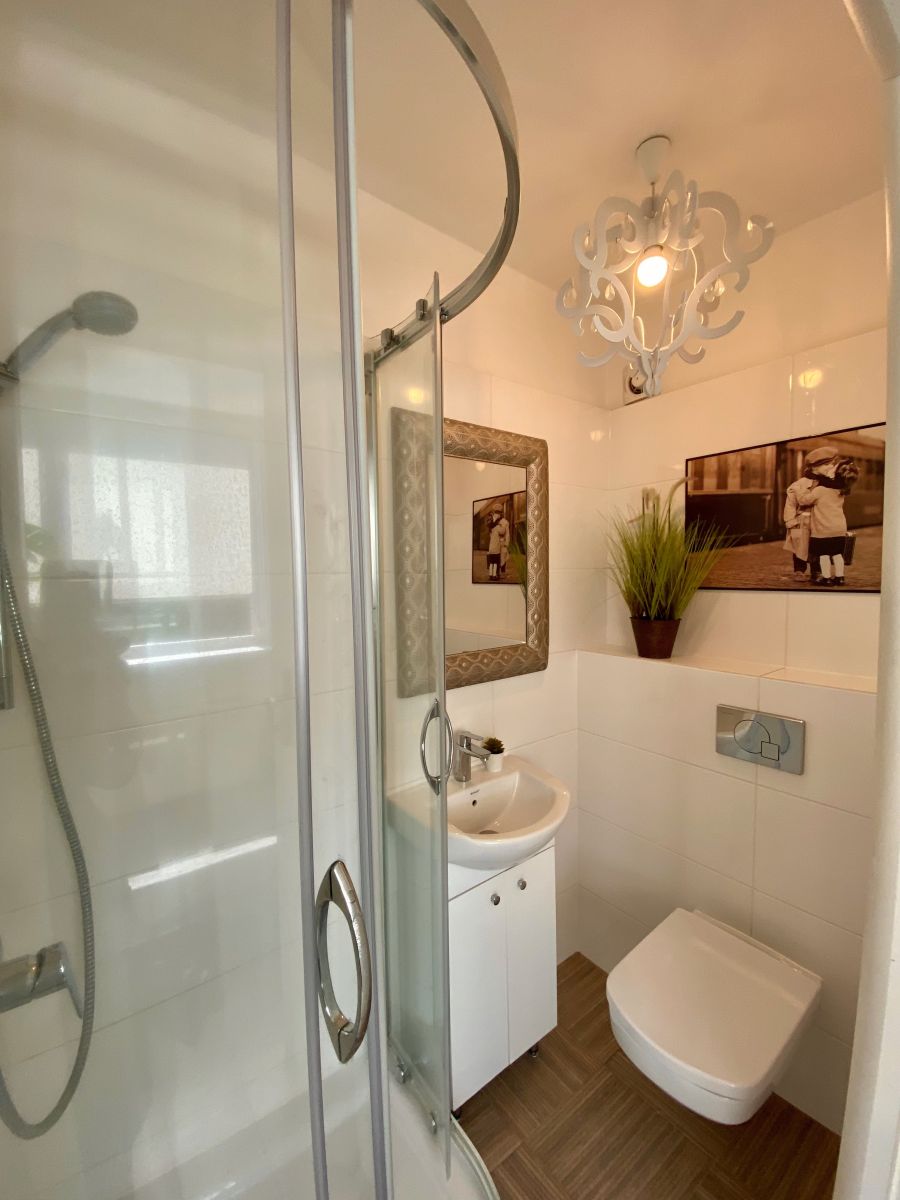 Pokój z prywatną łazienką w domu z ogrodem. Internet światłowodowy w cenie. Na posesji zadaszone miejsce na rowery /Room with private bathroom in a house with a garden. Fiber-optic internet included. There is a roofed place for bicycles on the property.